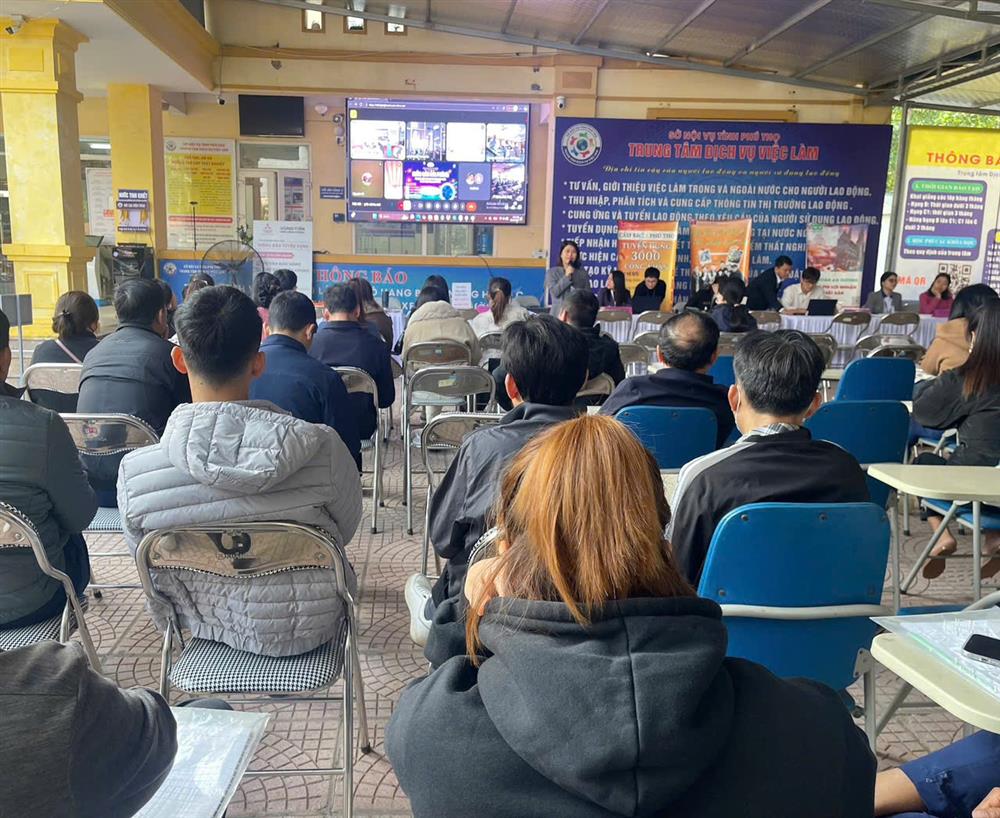 Song song với hoạt động trực tiếp tại Tuyên Quang, Trung tâm Dịch vụ việc làm Phú Thọ đảm nhiệm vai trò điểm tổ chức phiên giao dịch việc làm trực tuyến, hỗ trợ người lao động trên địa bàn tỉnh tiếp cận doanh nghiệp thông qua hệ thống kết nối online. Hệ thống hạ tầng kỹ thuật, trang thiết bị và đội ngũ cán bộ hỗ trợ được chuẩn bị đầy đủ, bảo đảm quá trình phỏng vấn và trao đổi thông tin giữa doanh nghiệp và người lao động diễn ra thuận lợi.