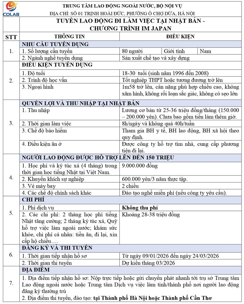 4. Thời gian đào tạo tiếng Nhật và giáo dục định hướng: 06 tháng tại Cơ sở đào tạo của Trung tâm Lao động ngoài nước ở Hà Nội hoặc Cần Thơ
